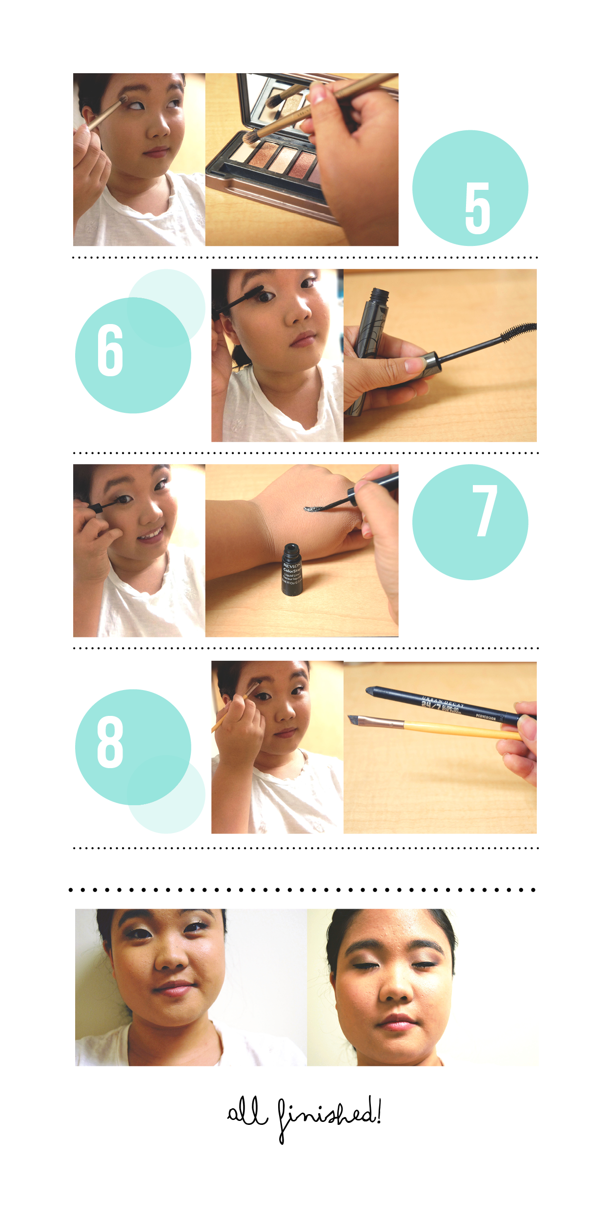 - Using my Revlon Colorstay liquid eyeliner, I lined my eyes with a thick line that came to a downward facing triangle at the end. This is a line which best suits the shape of my monolid eye, so I would recommend going with a liquid liner routine that works for you.