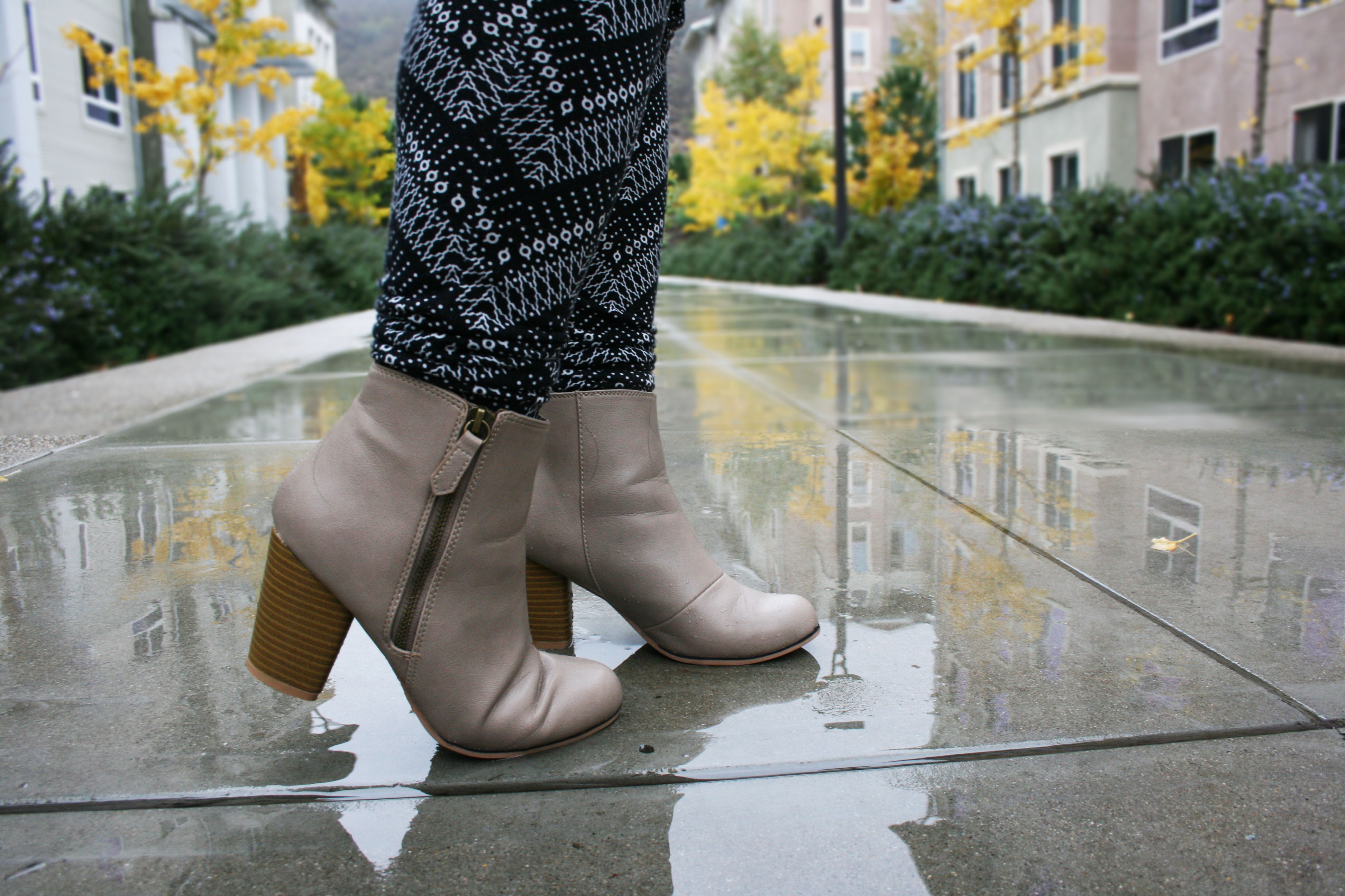 Although black and white is a classic combination, this graphic print is on trend for the season. The timeless color palette, however, makes adding color easy. I wanted to bring additional emphasis to the red elements of this outfit, so I opted for a neutral jacket and shoes to draw attention to those pops of color. The black faux leather jacket has been around for a few seasons, and I chose it for that reason, as I wanted another classic element to contrast with the trendy shoes. These heeled booties have become all the rage just within this current season. The color is also an alternative neutral (the popular “greige” trend of “grey”+”beige” which creates a beautiful taupe shade) that I chose so that the outfit was not overwhelmed with black and white.