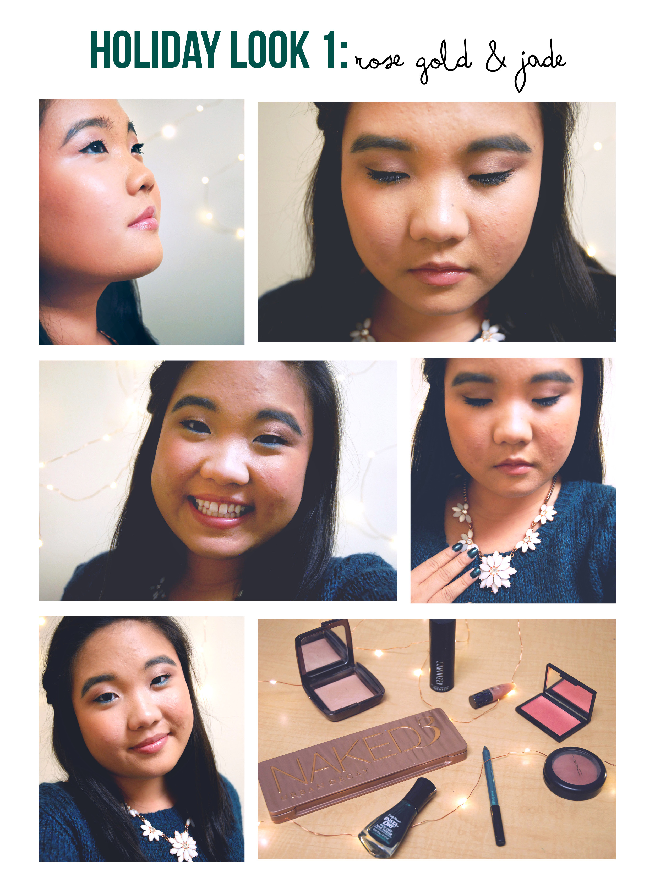 Look number one is perfect for a pop of color, without being overdone. I used rose gold neutrals to switch it up from the usual browns and taupes and paired it with a vibrant flash of jade to channel Christmas colors, without being overtly obvious. This look is perfect for any casual party with friends or co-worker as it is fun, but ultimately not overwhelming and it can also be dressed up or down.