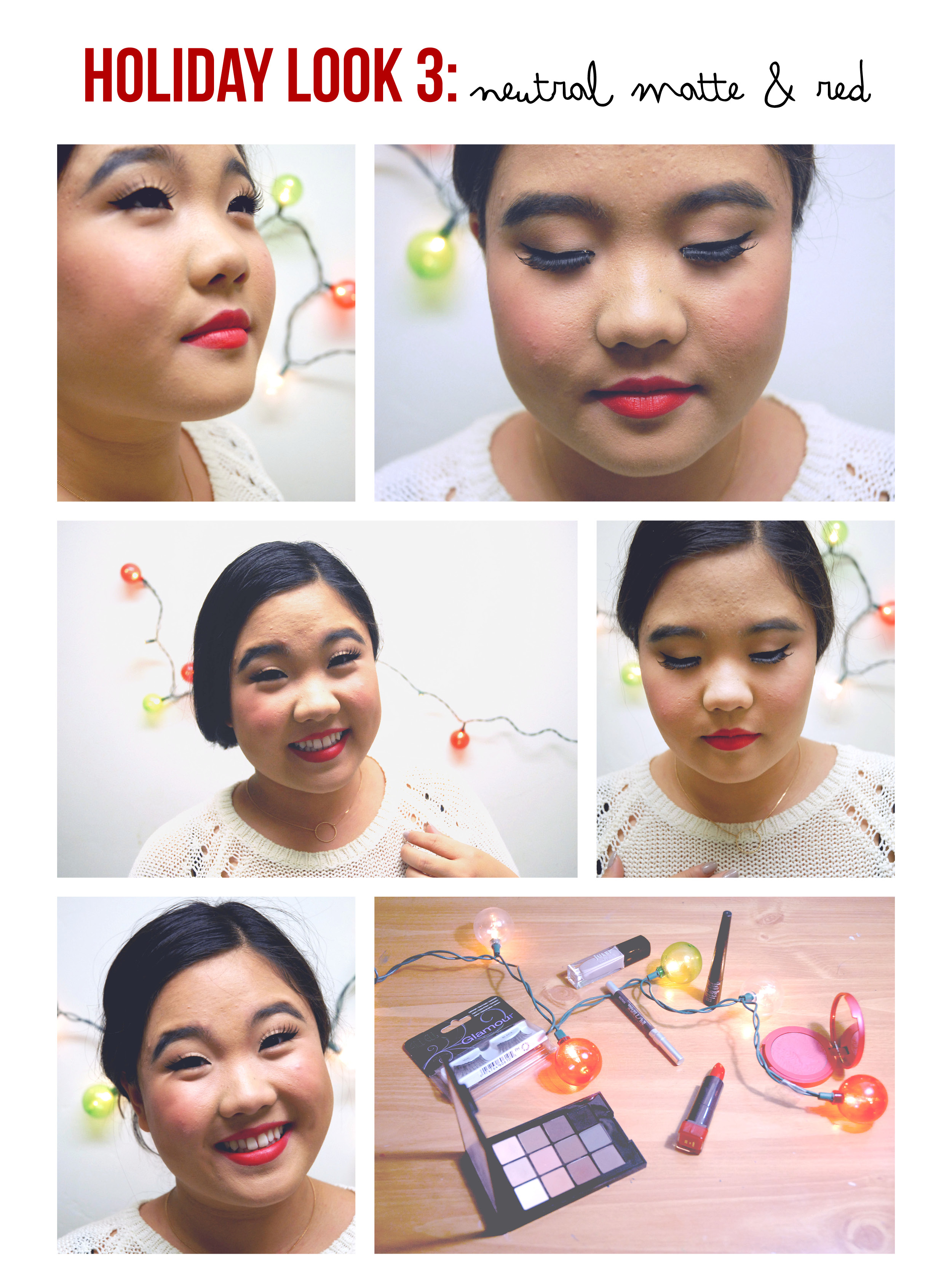 Finally, look number three is utterly classic, channeling a retro vibe. I used neutral matte eyeshadows to create a simple eye look that would act as a nice canvas for the heavy winged liner and fluttery false lashes I applied. I finished with a rosy cheek (it looks like just like Jack Frost has been nipping at your nose) and a timeless red statement lip that happens to be perfectly fitting for Christmas. This look is an all-around staple that could be worn to any function, but I find it most suitable for Christmas day itself. The quintessential elements of the makeup pair perfectly with the tradition of Christmas for the holiday season.