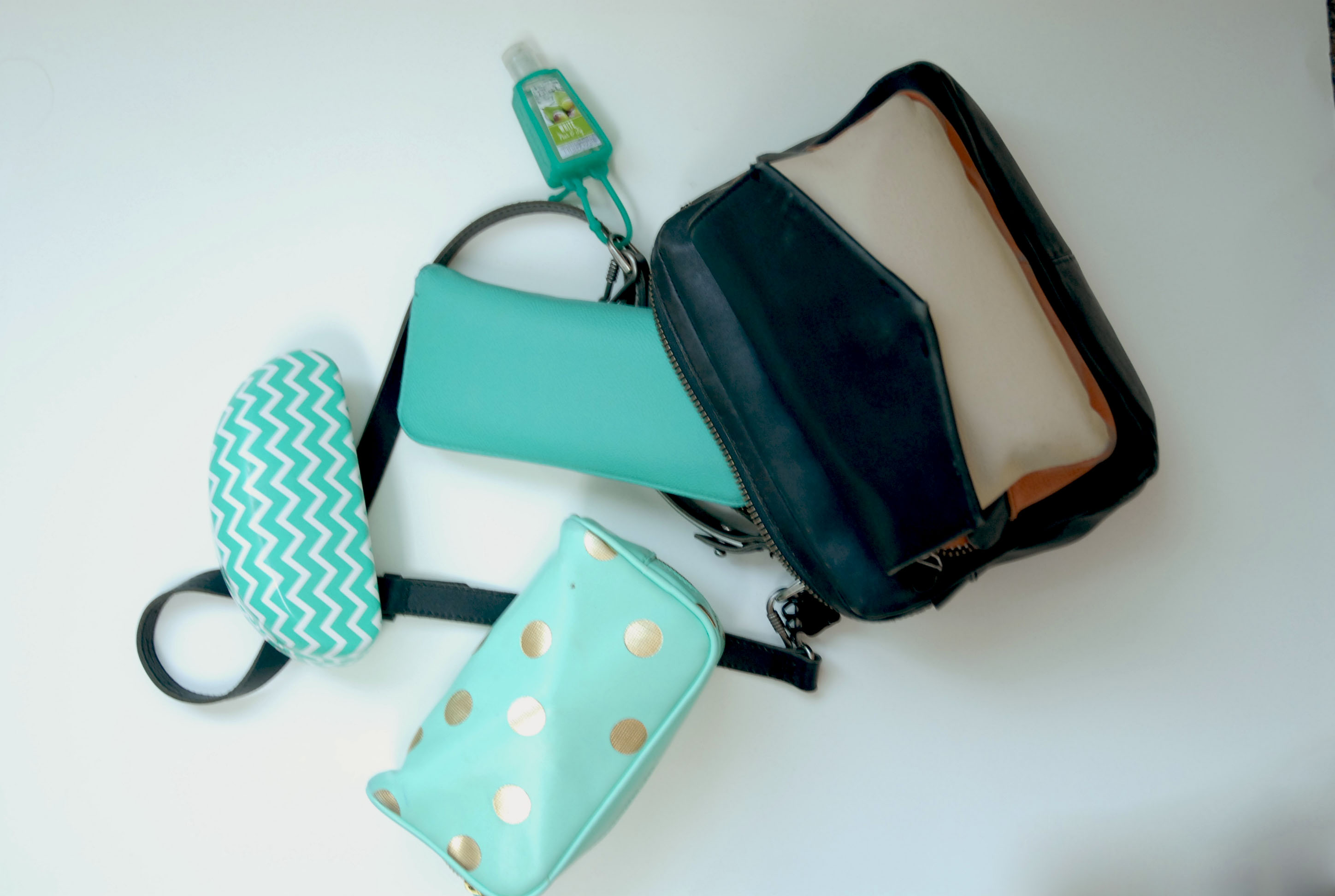 Notice a theme? If you read my last major post, you’ll know that I adore the color mint green. These are the basic elements I carry around with me: my sunglasses case, a pouch, and my wallets. The wallets and pouch go in the large compartment and the sunglasses case lives in the front part. There are also two small pockets on the inside of the larger compartment, but more on that later.