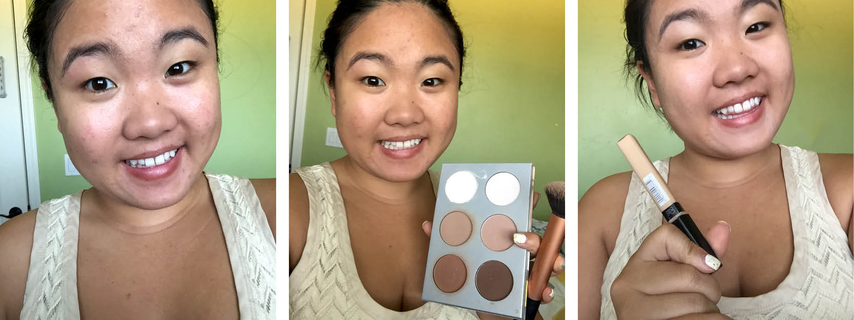 - First panel on the left is just me with one layer of the Age Defying Solar Shield on my face. I cleansed my face before applying with a Beauty Blender. As you can see, it evened out the complexion of my skin nicely, however did not offer me much coverage to my blemishes. This is to be expected, though, as it is not a foundation but a tinted moisturizer. It also left my skin with a pretty dewy finish, as you can see here.